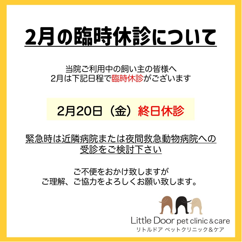 2月臨時休診のお知らせ 2026年1月25日 最終更新日時 : 2026年1月25日 ldshin 2月は20日(金)を臨時休診とさせて頂きます。2月の祝日に関しましては通常開院となります。 ご不便をおかけいたしますが、ご理解のほどよろしくお願い致します。