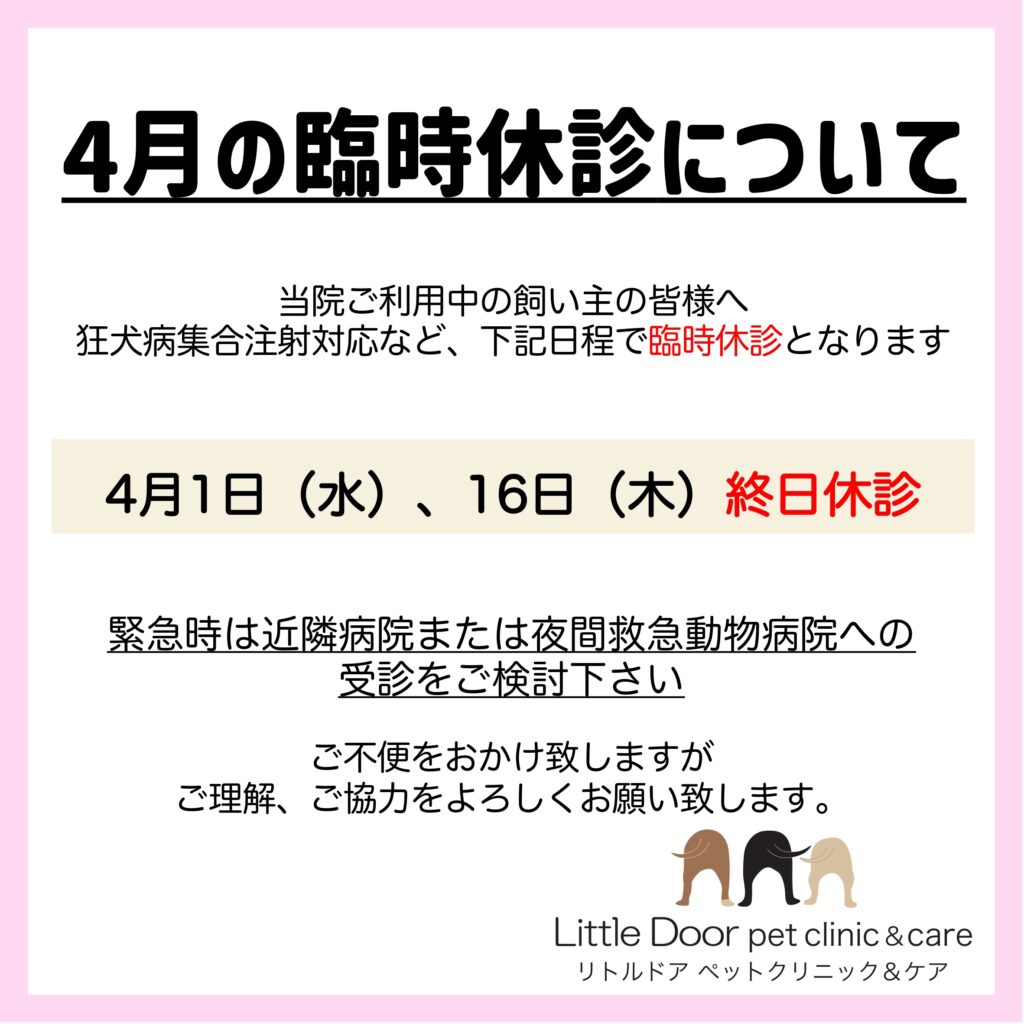 4月は狂犬病集合注射対応などがあり、1日および16日が臨時休診となります。