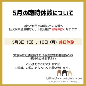 5月は狂犬病集合注射への参加など、臨時休診がございます。5月3日(日)、18日(月)を臨時休診とさせて頂きます。 また、フィラリア・ワクチン注射など予防のご予約を多くいただいています。予約が埋まりやすい状況が続いておりま […]